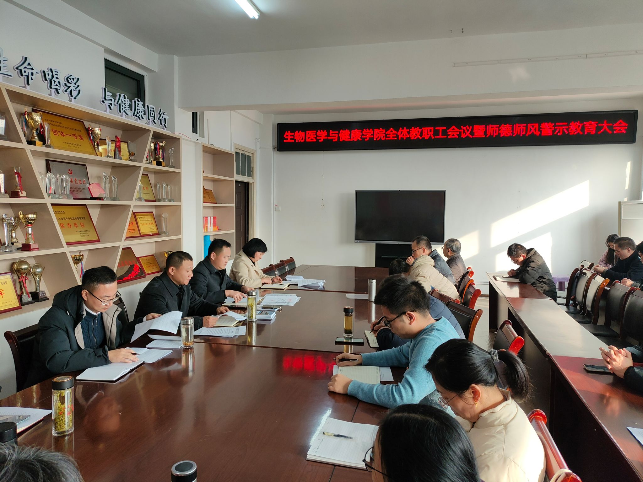 根据学校统一部署,12月6日下午,生物医学与健康学院在学知楼417会议室召开师德师风专题警示教育大会。学院党政领导出席会议,全体教职工参加会议。学院党委书记张传德主持会议。