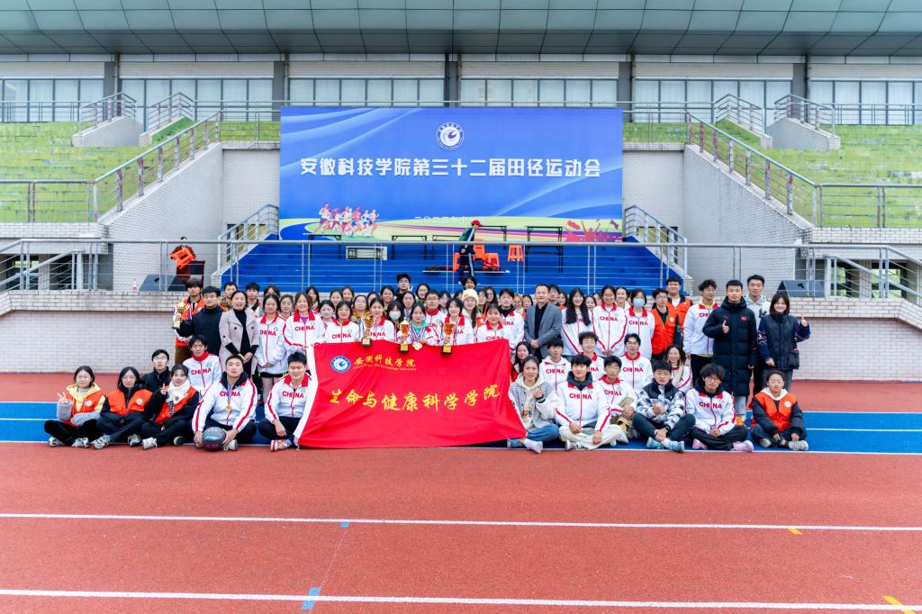 安徽科技学院校第三十二届田径运动会于11月10日下午在凤阳校区圆满落幕。 此次运动会中,生命与健康科学学院的运动健儿们顽强拼搏、竭尽全力,取得了耀眼的成绩。最终学院荣获女子甲组团体总分第一名、男子甲组团体总分第三名、学生团体甲组总分第三名的优异成绩;学院均斩获女子铅球、跳远、4×;100米接力赛、三级跳远、400米,男子标枪,教职工团体女子对地反弹乒乓球项目第一名,各个项目都有我院运动员拼搏的身影,并取得多项佳绩。本届运动会上,生命与健康科学学院共有62名学生运动员、20名教职工参加比赛,学生组织全体工作人员及各班级同学均负责后勤保障工作。
