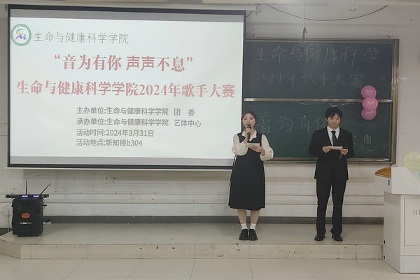 为丰富学生的课余生活,提升当代大学生艺术素养,3月31日晚,生命与健康科学学院在新知楼B304教室举办“音为有你, 声声不息”2024年歌手大赛决赛。动物科学学院艺体中心主任黄婧雯,农学院主席团成员蒋传博,人文学院艺术与体育中心综合部部长苏文奕,外国语学院艺体中心文艺部部长陈宇欣,大学生歌手协会会长杨濛濛受邀担任评委,学院星源艺术团主持队副队长汪洲、主持队成员杨艺越主持本次比赛。