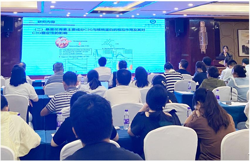 会议由安徽省农业科学院园艺研究所所长高正辉主持,介绍了会议的主要目的,然后会议内容主要围绕果树、蔬菜、中药材、花卉等园艺作物种质资源收集保存和创制、优良品质选育、生理、绿色高效优质栽培技术研发及推广等研究工作展开交流。会议中,我校青年教师徐静静以题目《核桃蛋白对桑葚花青素稳定性的影响及桑葚核桃蛋白饮料的研制》作出报告,提出了核桃蛋白与桑葚花青素的相互作用方式及对桑葚花青素稳定性提高的显著效果,开发了一种具有特殊风味的桑葚核桃蛋白饮料,为桑葚花青素相关食品的开发及应用提供重要的理论依据。