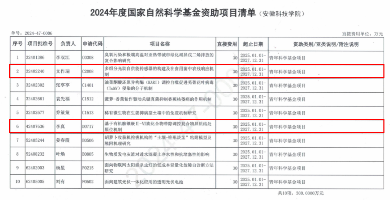 近日,2024年度国家自然科学基金项目评审结果揭晓,我院文作瑞博士主持的“多组分光助自供能传感器的构建及在食用菌中农残响应机制”和李真博士主持的“基于有机胺镶嵌Ⅱ-Ⅵ族化合物带隙调控复合物异质结处原位机制”双双获得立项资助。本年度国家自然科学基金立项数刷新我院历史纪录,实现基础研究领域的重大突破。