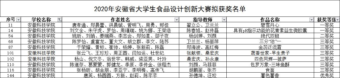 中国足彩网: “凤宝杯”安徽省大学生食品设计创新大赛,学院有十件参赛作品被推选参加“凤宝杯”安徽省大学生食品设计创新大赛,获一等奖4件、二等奖3件、三等奖1件。2020年 “三只松鼠杯”安徽省食品设计创新大赛,学院参赛作品共获一等奖2项,二等奖1项,三等奖6项,优秀奖1项。
