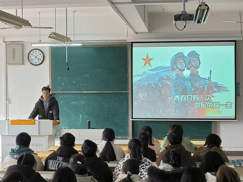 线下由各班主任召开主题班会,开展爱国主义教育,介绍中国人民军队的优良传统,引导同学们更加深入地理解习近平强军思想对国防和军队建设的意义,向同学们详细解读了学费补偿、助学贷款代偿、退役学生学费减免政策以及退役复学学生课程免修、转专业、创新创业、毕业设计和论文答辩等方面的优抚优待政策和相关激励政策。并勉励同学们要坚定从军信心、提高思想觉悟、增强身体素质、做好入伍准备、努力报效祖国。