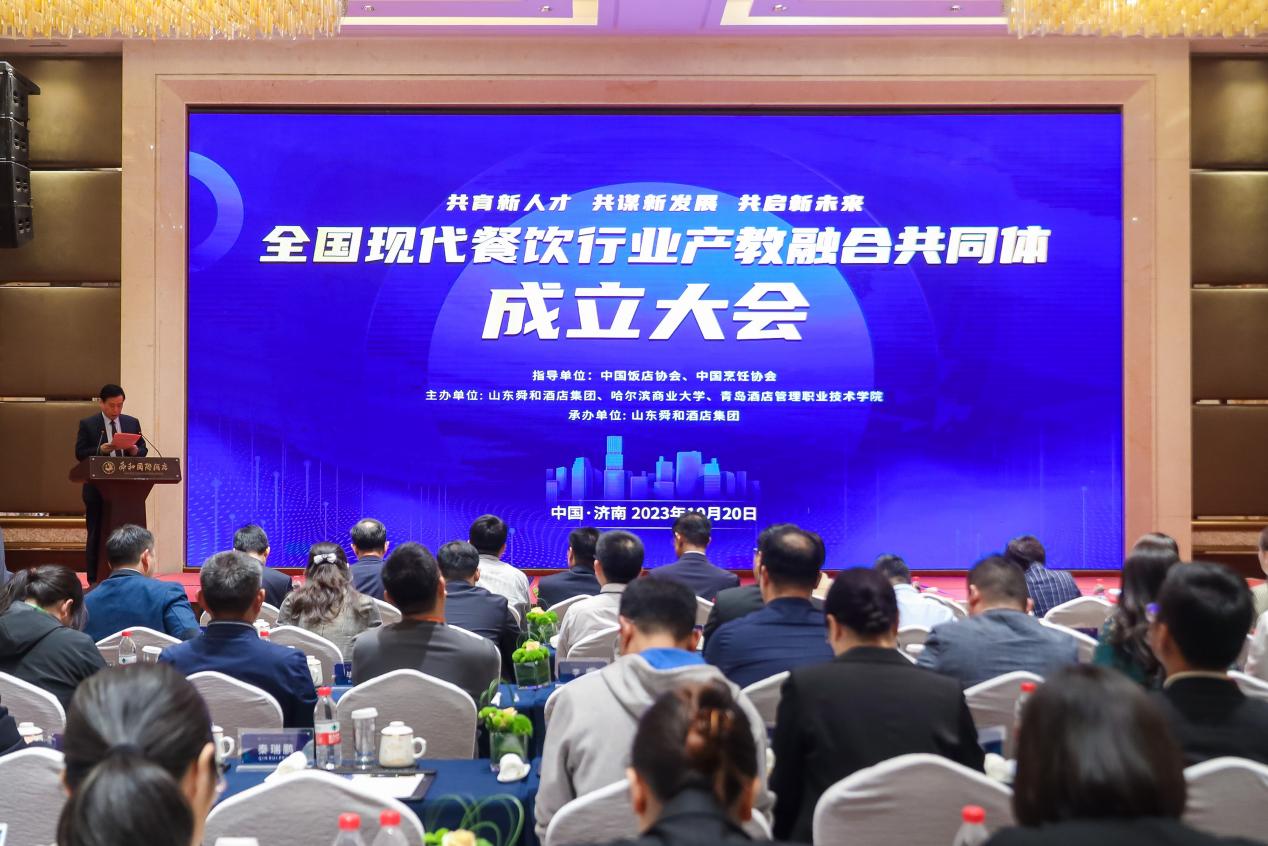 2023年10月20日,全国现代餐饮行业产教融合共同体成立大会在济南召开,此共同体的成立旨在深入探索产教融合新路径,努力开创产教融合新格局。会议由哈尔滨商业大学、青岛酒店管理职业技术学院、山东舜和酒店集团有限公司牵头组织,有16所高等学校、58所职业院校、31家企业、4家行业协会、3家科研机构在内的112家单位共同参与。我校被授予常务理事单位,食品工程学院副院长郑海波和烹饪与营养教育专业教师代表刘勇受邀参加此次会议。