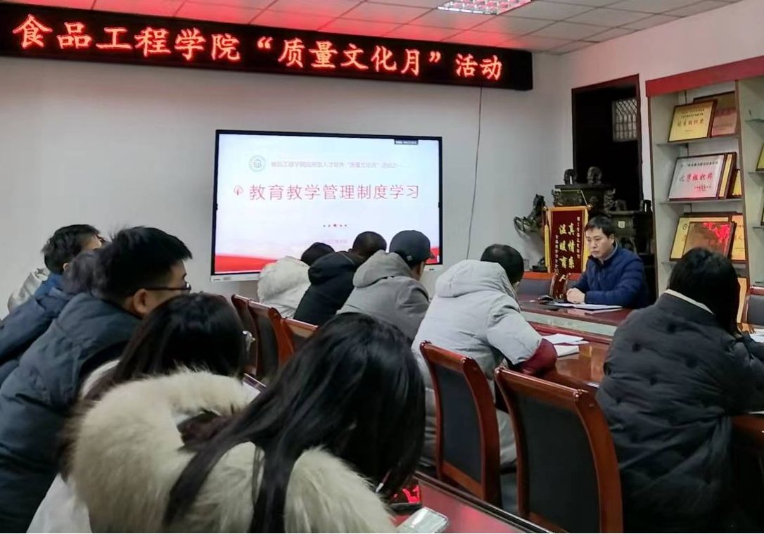为全面贯彻党的教育方针,落实立德树人根本任务,培养德智体美劳全面发展的高素质应用型人才,提高人才培养质量,1月3日下午,食品工程学院在学院会议室开展了应用型人才培养以“质量文化月”为主题的系列活动。学院党政领导及全体教师参加了活动,活动由学院副院长郑海波主持。
