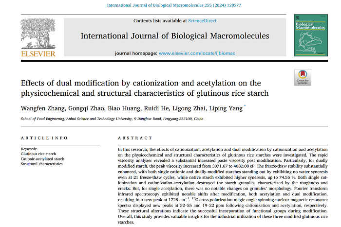 近日,我校2021级食品加工与安全领域研究生张王芬在生化与分子生物学领域Top一区期刊International Journal of Biological Macromolecules(IF=8.2)在线发表题为“Effects of Dual Modification by Cationization and Acetylation on the Physicochemical and Structural Characteristics of Glutinous Rice Starch”的研究论文。食品工程学院粮油及其副产物精深加工团队与营养科技创新团负责人队杨丽萍副教授为通讯作者,安徽科技学院为唯一完成单位。