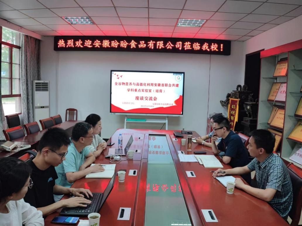 6月18日,安徽盼盼食品有限公司企业品管经理谢艳、财务经理连振平等一行4人莅临安徽科技学院食品工程学院,针对于全谷物营养与高值化利用安徽省联合共建学科重点实验室(培育)建设进展及未来规划进行会谈交流。此次交流会旨在进一步推动双方在全谷物营养与高值化利用安徽省联合共建学科重点实验室(培育)建设方面的科研交流与合作。会议由食品工程学院副院长翟立公主持。