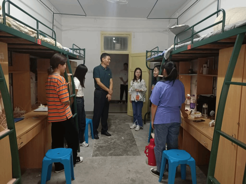 走进新生宿舍,付光玺详细询问了新生们对生活环境的适应情况,并嘱咐新生们要注意宿舍卫生和安全,营造一个良好的住宿环境。在与新生的交谈过程中,老师们的和蔼可亲感染着身边每一个人。同学们也热情迎接,积极响应,寝室里洋溢着师生间的融融情谊。一句亲切的问候“同学们,老师来看看大家”,话语带着春风化雨的力量,化去了同学们的紧张,添了几分真诚的笑容,极大的促进了师生之间的感情交流。