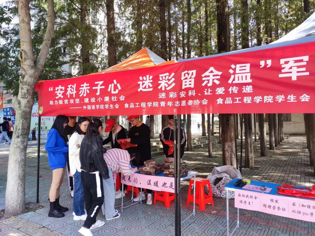 为倡导并践行环保节能的优良生活作风,实现军训服装的循环使用,践行向上向善的价值追求,营造为他人送温暖、做贡献的良好氛围。10月10日至10月12日三天,食品工程学院学生会、外国语学院学生会、生命与健康科学学院学生会、食品工程学院青年志愿者协会面向全校新生联合发起了“安科赤子心,迷彩留余温”军训服装捐赠活动,号召学校广大新生学子将军训服装捐赠出去,让迷彩继续发挥它们温度。