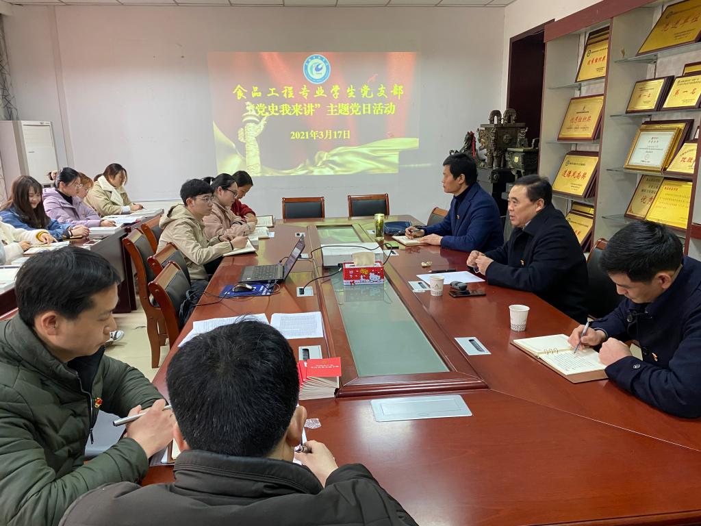 为庆祝即将到来的中国共产党百年华诞,进一步加强支部党的建设,开展党史学习教育,3月17日下午,校党委副书记韦文联为食品工程专业学生党支部讲授微党课,党总支书记付光玺主持会议。
