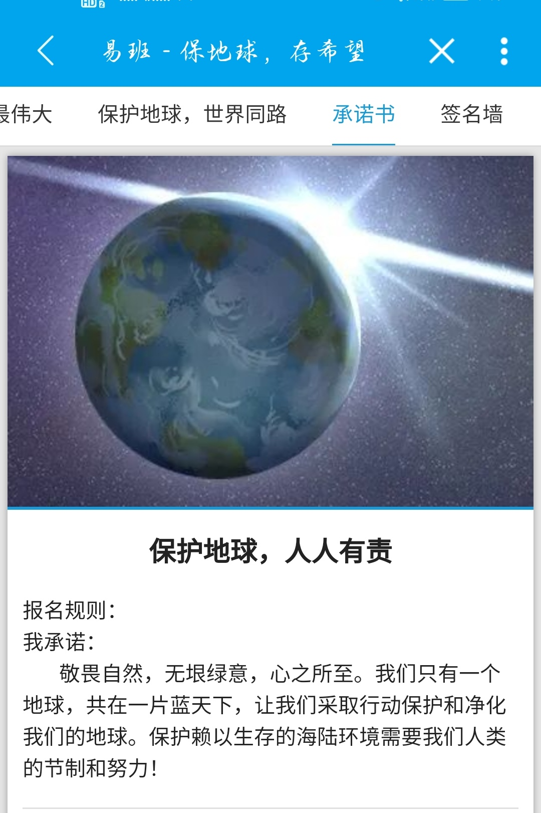 本次活动使用易班APP线上推出轻应用供同学们线上签署承诺书,同时在线下进行PU学时签到。在轻应用中同学们可以清楚地了解世界地球日的由来、意义等,让同学们认识和了解这个日子,同时增强同学们保护地球的意识。地球是人类赖以生存的家园,保护地球,是每个人的责任,我们都有义务用自己的行动保护我们生存的家园。人与自然是共存,共生,共荣的关系,我们必须尊重自然,正确对待人与自然的关系。善待保护生态,就是在保护自己。同学们积极签署“保护地球,人人有责”承诺书,用自身行动诠释当代大学生大力推动生态文明建设,树立尊重自然,顺应自然,保护自然的生态文明理念,为建设美丽中国不断努力。在生活中,同学们也会用自己的实际行动展现出对地球的爱护。