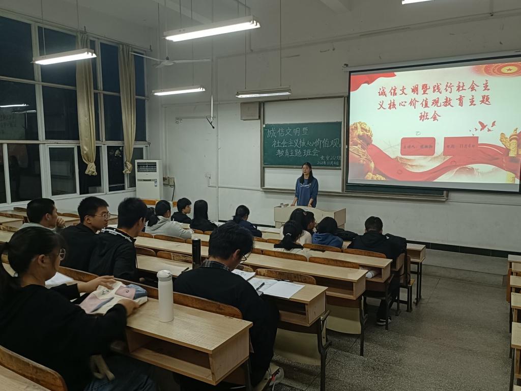 为加强诚信文明教育,弘扬和践行社会主义核心价值观,11月4日,食品工程学院组织各2021级新生班级开展了诚信文明暨践行社会主义核心价值观主题教育班会。各2021级班级学生参加。