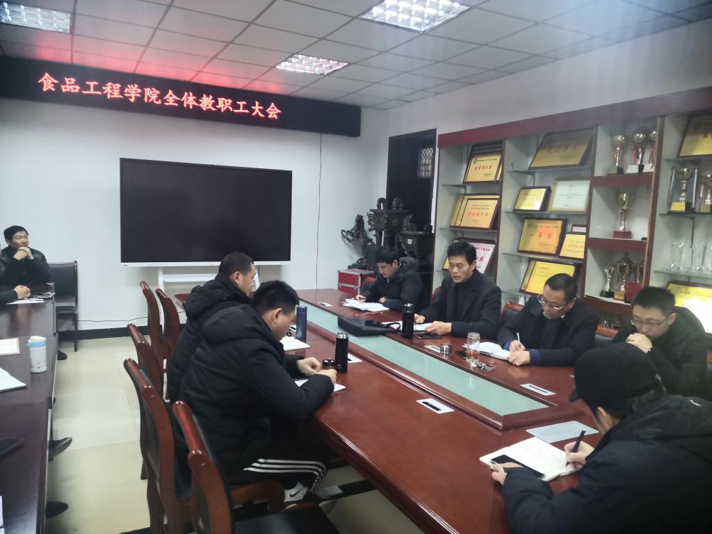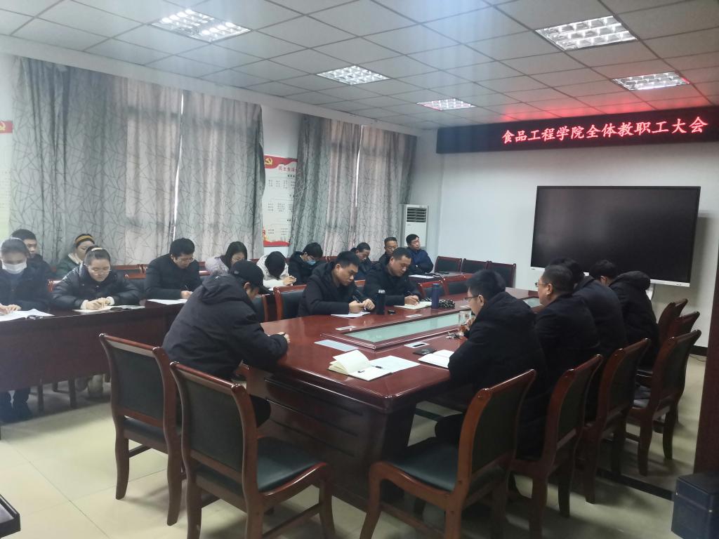 1月7日下午,食品工程学院在学院会议室召开期末全体教职工大会,总结学院期末工作,安排布置假期及下学期初各项重点工作。全体教职工参加。院党委书记付光玺主持会议。
