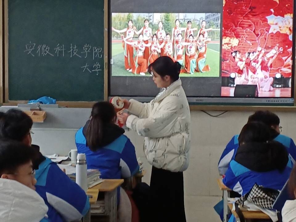 在交流会上,团队播放了安徽科技学院的宣传片,向同学们介绍了安科的历史渊源、教学环境、校园活动等,并向同学们详细介绍了安徽科技学院的办学条件、师资水平、招生就业、考研录取率等。随后,朱仪雯将安徽科技学院的纪念尺和自制的食品工程学院的小饼干分发给同学们。现场气氛活跃,同学们踊跃表达了自己的看法和期望。团队成员在分享自己大学经验的同时,注重鼓励同学们明确人生目标,增强学习热情,奋进争先,勇往直前。