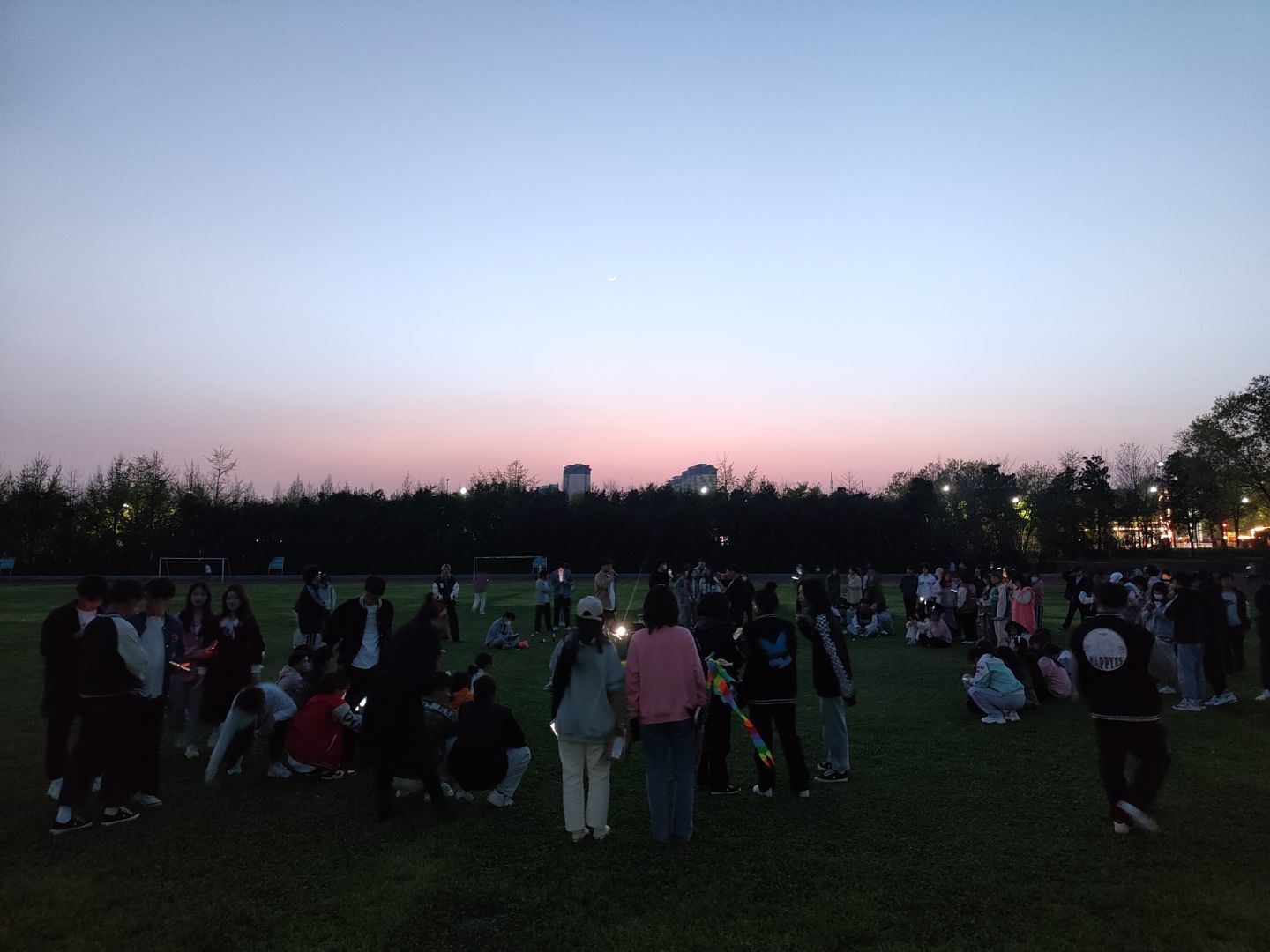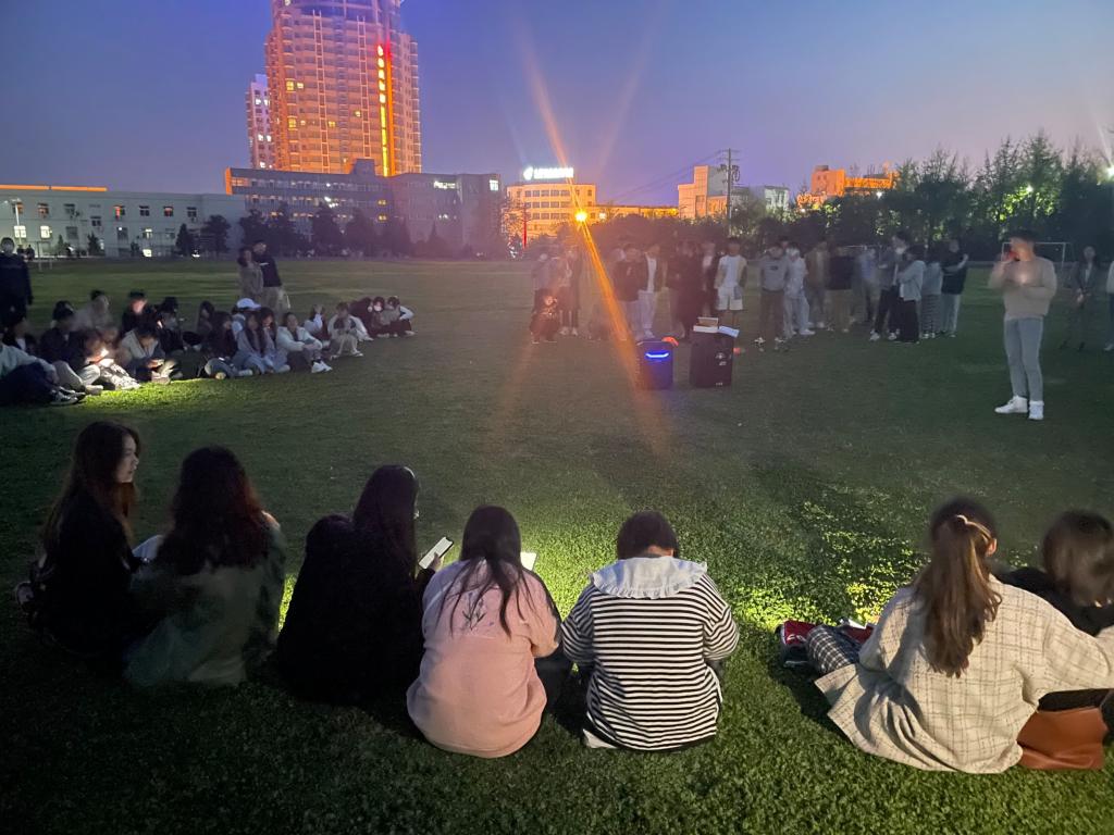 皓月当空,草地与音乐相伴。绿茵场上同学们席地而坐,挥舞闪光灯,随歌声摇摆。舒缓优美的《董小姐》、满含青春与梦想的《老男孩》,一首首青春之歌响起,同学们沉浸在歌声的海洋。音乐、灯光、夜风、旋律是耳机传达不出的氛围,现场展现的是音乐的青春气息。