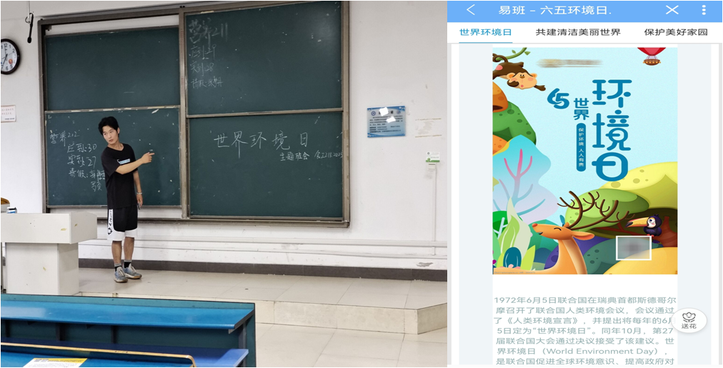 活动通过线下和线上易班宣传等多种方式开展。一是通过制作宣传展板、组织学生参与环保签名等形式,宣传环境保护相关知识;二是各班级召开环境保护主题班会,认真学习新发展理念,介绍国家生态文明建设成果,感受周边自然环境的变化,真切体会“绿水青山就是金山银山”科学论断的重要意义,开展《公民生态环境行为规范(试行)》宣传,倡导简约适度、绿色低碳生活方式。三是通过易班宣传教育环保意识,教育引导广大学生从自身做起,从身边做起,节电、节水、节粮、节能,不随便乱丢垃圾,爱护公共财物,切实增强环境意识、节约意识、生态意识,积极选择低碳、节俭、环保的绿色生活方式和消费模式。活动过程,同学们都积极参与,表示将为环保事业和生态文明建设做出贡献。