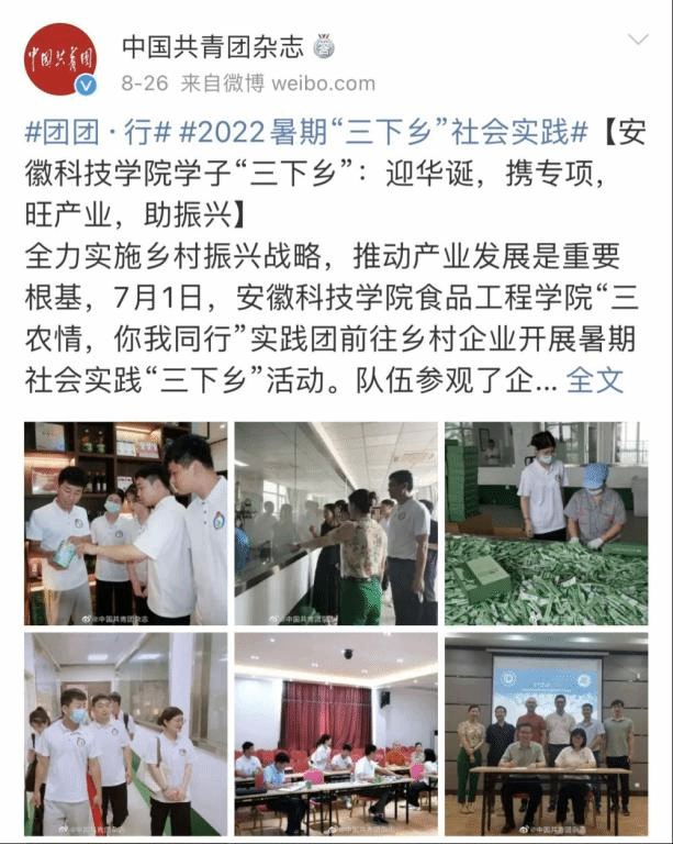 此次暑期社会实践活动事迹受到了《中国共青团杂志》的官方报道,通过本次暑期社会实践“三下乡”活动,实践团深入乡村企业,实地考察走访,普及食品安全知识,不断地提升自身专业素养;在丰富的实践活动中,更加深刻地认识到作为食品学子的义务和担当,为推进乡村振兴战略贡献青春力量。(特约通讯员:程韬 审核:王广良)