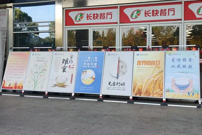 开展线下学习宣传活动,体验式交互交流。为提升广大师生参与感,学院在西区食堂入口及学生来往较多的广场处设立专栏,宣传推介典型案例,讲好中国粮食故事,并开展了签名活动。“一粒米的故事”以形象生动的漫画形式展现了粮食的来之不易,“节约粮食”、“光盘行动”、“爱惜粮食,从我做起”的标语深入人心,来往师生在签名墙上郑重地写下自己的姓名,成为保护粮食安全的践行者之一,营造了爱粮节粮的浓厚氛围。