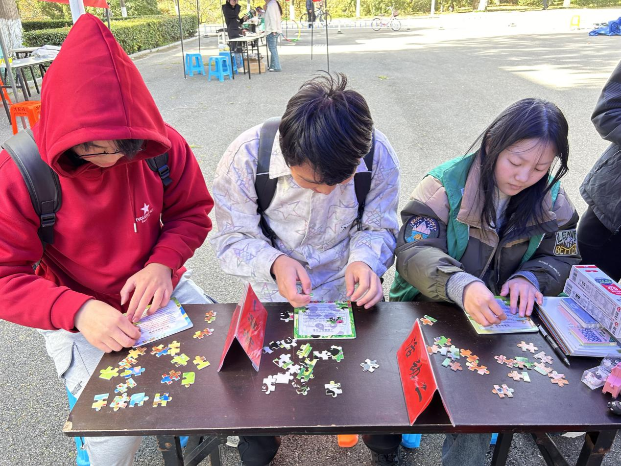 踏入活动现场,迎面而来的是热闹欢乐的氛围。现场游戏分为两个环节,分别是“指尖狂欢,拼出快乐”的拼图小游戏和“果蔬妙译,趣享秋日”的英汉互译活动。在拼图区域,同学们团团围坐,手忙脚乱地拼着图,一个个都像小蜜蜂一样忙得不亦乐乎。这边有人刚拼好一片,那边就传来一片欢呼声。此任务不仅是对耐心的考验,更是对细致观察能力的一次深入检验。在英汉互翻环节中,参与者们面对提问时都能轻松应对,准确地回答出正确答案。通过将食品相关专业知识巧妙地融入益智活动中,游戏显著提升了学习的趣味性。活动完成后,同学们到指定区域领取丰富的奖品。