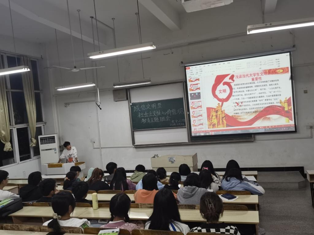 为加强诚信文明教育,弘扬和践行社会主义核心价值观,11月4日,食品工程学院组织各2021级新生班级开展了诚信文明暨践行社会主义核心价值观主题教育班会。各2021级班级学生参加。