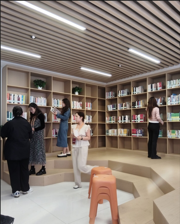 此次参加活动的图书馆流通部主任刘传燕老师克服天热和断水的情况,把“耕读书屋”打扫整理的井然有序,期间利用午休时间给同学们介绍了“耕读书屋”,同学们自由的穿梭在图书中,仔细选读现场的图书。