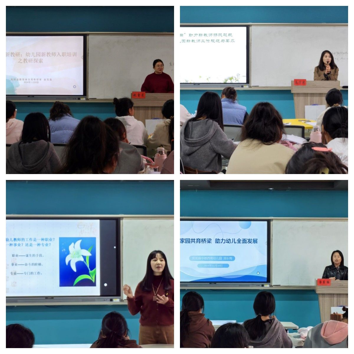 安徽科技学院副教授周海平围绕教育数字化与教师发展,分享了教育数字化相关研究、基础教育中数字化实践途径和常用的AI工具。凤阳县教师进修学校校长张雷强调教师应掌握备课、上课、听课、反思的基本方法,开启精进之路,尽快站稳讲台。安徽科技学院副教授赵庆灿强调教师应崇德修身,为人师表,做一名党和人民满意的好老师。凤阳县教育体育局教研室学前教育教研员赵雪莲主任开展了题为“新起点,新教研:幼儿园新教师教研探索”的专题讲座,围绕幼儿园教研的概念、园本教研的内容、优秀教研案例分享及县域教研的实施。
