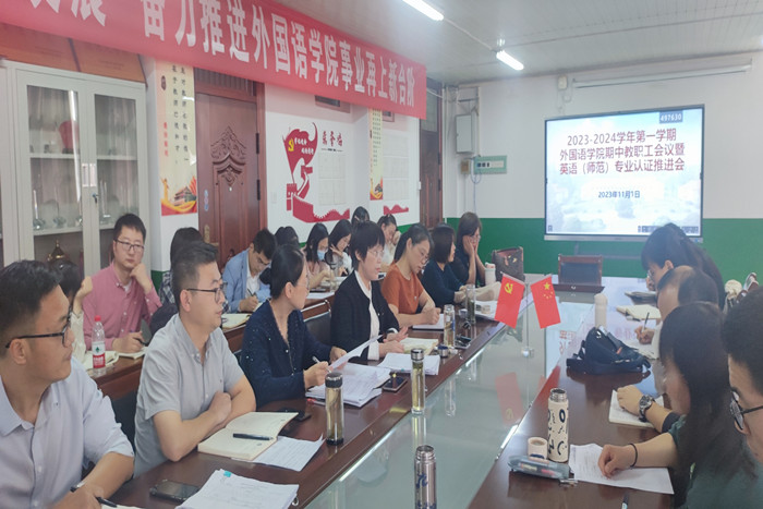 外国语学院召开2023-2024-1学期期中教职工大会暨英语(师范)专业认证推进会