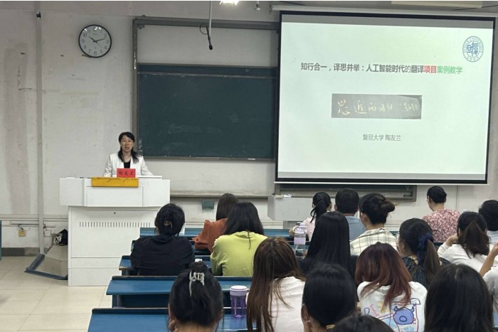 学科专业建设报告会邀请复旦大学外文学院博士生导师、翻译系主任、翻译硕士教育中心主任、国际传播领军人才陶友兰教授现场讲学,指导翻译学科建设、翻译专业人才培养及人工智能时代翻译教学。陶教授以“知行合一,译思并举:人工智能时代的翻译项目案例教学”为题,围绕人工智能对翻译教育与学习的挑战,深入剖析翻译实践教学面临的问题及对策,以真实翻译项目的案例教学为例,介绍了复旦大学以技术赋能翻译人才培养的举措与经验。中国足彩网外国语学院学科专业建设,陶教授紧紧结合外国语学院自身实际,重点分享了翻译学科建设中的问题与对策,提出高层次、应用型及职业化的发展定位,以澳、德、英、美等国及复旦大学的翻译人才培养为案例,阐述经验与启示,解答学科建设中的盲点和痛点。