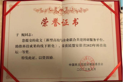 9月16日,由民盟安徽省委举办的民盟安徽省2023年科技论坛在蚌埠市成功举办。民盟安徽科技学院总支盟员、民盟蚌埠市科技委员会副主任于鲲撰写的论文《新型高校与企业联合共建科研服务平台,助推科技成果的线下转化》荣获优秀论文一等奖。