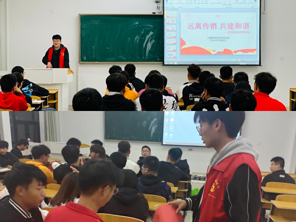 活动期间,各学生党员采取集中宣传宣讲和全面宣传相结合的方式,深入班级晚自习课堂围绕“什么是传销”、“传销的骗术有哪些”、“传销的危害”、“遇到传销该怎么办”等四个方面开展宣讲;并成立学生党员防范传销宣传志愿者队伍深入校园各个角落,向同学们发放宣传册页、现场讲解相关案例,揭示传销的本质与危害,警示大家要增强自我保护意识,自觉抵制传销。