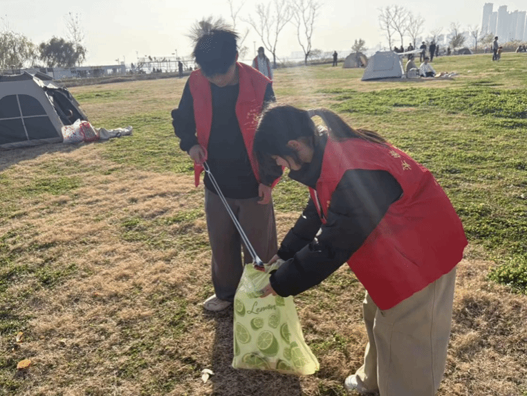 在活动现场,志愿者们分为“清理分类+清洁维护+创意宣传”三组分工协作:有的手持垃圾袋,沿步道、草坪及水域周边清理塑料瓶、包装袋等垃圾并分类归集;有的用扫帚、垃圾夹清扫落叶与尘土,让公园步道恢复整洁;在环保DIY环节,大家收集自然落叶,写下“守护湿地”、“善待生灵”等暖心寄语,将叶片贴制成创意贴画,用文艺方式传递生态理念。志愿者们不怕脏、不怕累,穿梭在湿地的草丛与岸边,用实际行动践行志愿服务精神,成为龙子湖湿地一道亮丽的青春风景线。