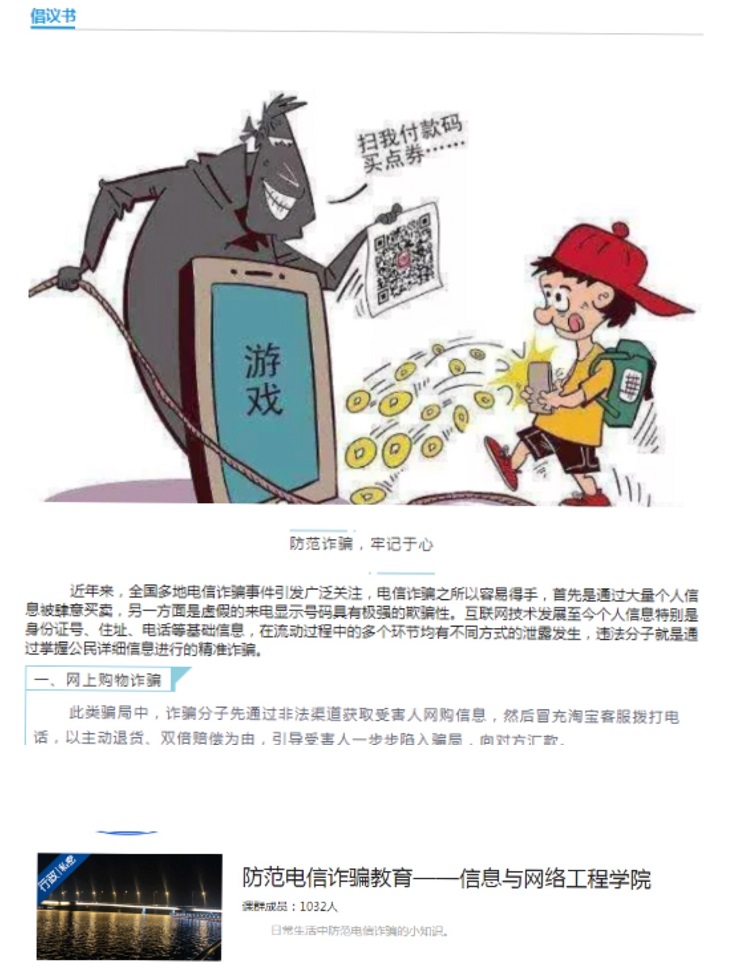 10月20—23日,学院在易班平台搭建了“防范电信诈骗倡议书”轻应用,充分利用知识学习模块将网上购物诈骗、票务售卖暗藏骗机、冒充熟人来骗钱、兼职刷单有风险、游戏中的诈骗术、利滚利之校园贷等多种骗局进行线上案例展示。1122名学生主动学习各类防范诈骗知识并签署倡议书,在学习防范诈骗知识的过程中,有581名学生围绕着电信诈骗种类、潜在风险以及亲身经历等方面参与讨论,倡议活动和签名受到校相关部门以及其他学院师生广泛关注。