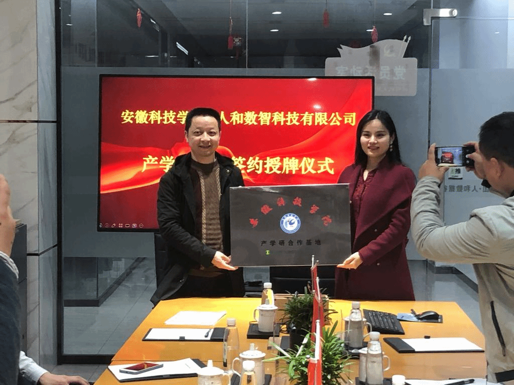 余宏杰代表学校与人和数智科技有限公司签订了校企合作框架协议书,并进行了安徽科技学院产学研合作基地授牌仪式。