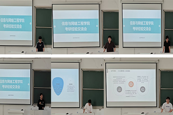 4月23日下午,信息与网络工程学院在致知楼B111举办考研经验交流会。学院党委副书记韦乃学、专职辅导员许磊、2025届优秀考研学子代表林璋圣、刘坤、盛猛、郭祖硕、陶一繁、张佳威出席本次交流会,学院2026届各班考研同学参加本次会议,会议由许磊主持。