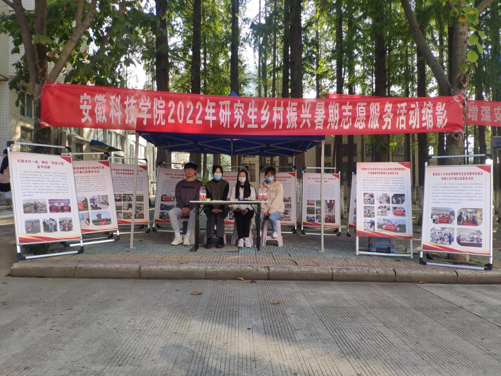 为践行全国农科研究生志愿服务联盟宗旨,引导广大农科研究生深入基层一线,助力乡村振兴,选树典型引领示范,提升实践能力,培养创新精神,增强社会责任感,10月22日,安徽科技学院研究生青年志愿者协会在凤阳校区举办2022年研究生乡村振兴暑期志愿服务活动成果展。