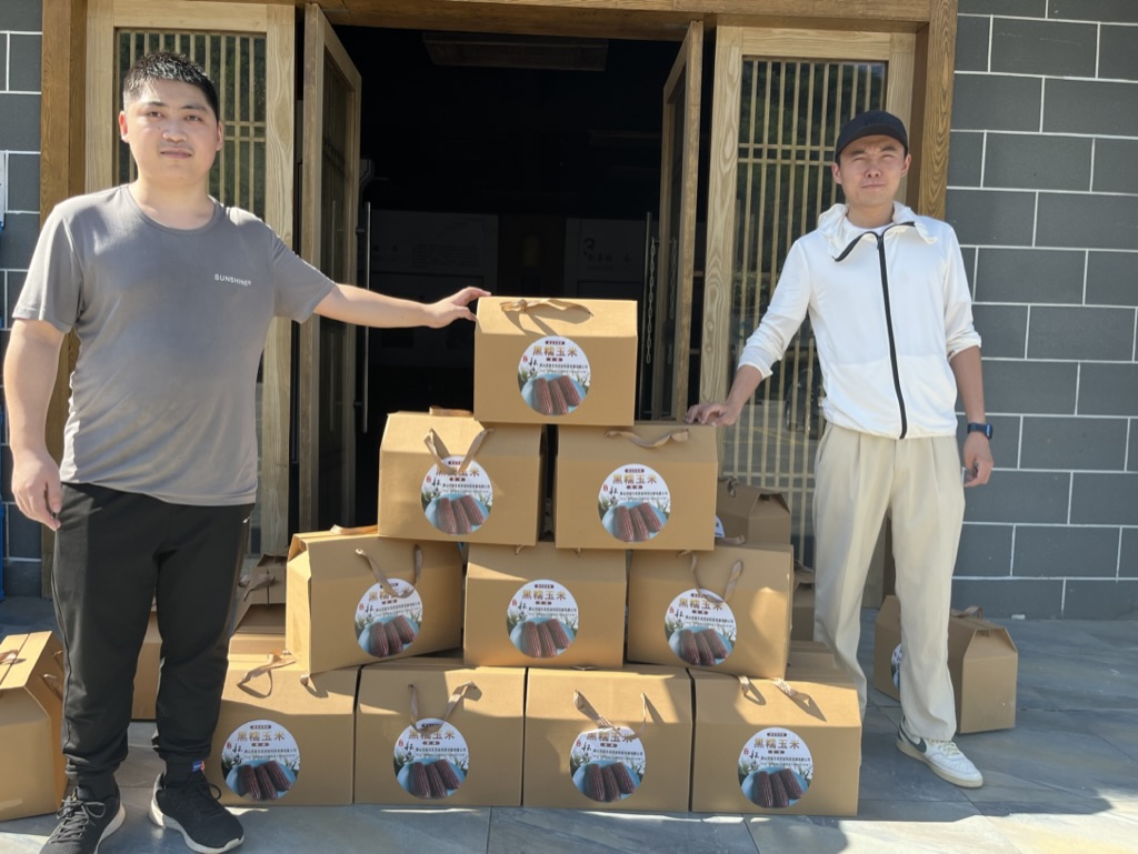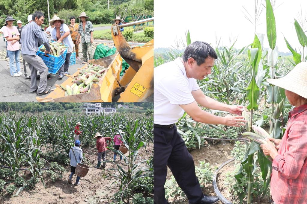 在溪头镇桃源村的菊花地上,菊花长势良好,安徽科技学院歙县贡菊科技小院驻站研究生公维勇、方俊超和村民正顶着烈日抢收玉米。采收的过程中,大家脸上洋溢着丰收的喜悦,一筐筐玉米被采摘下来称重、分销。