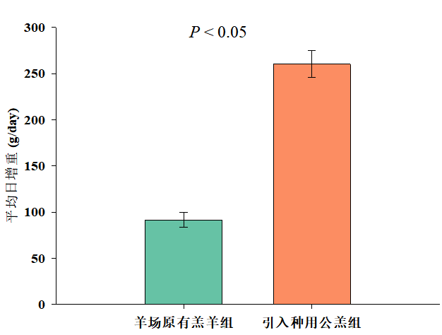 图2良种引进与护理及羊场原有羔羊组与引入种用公羔组羊只日增重变化