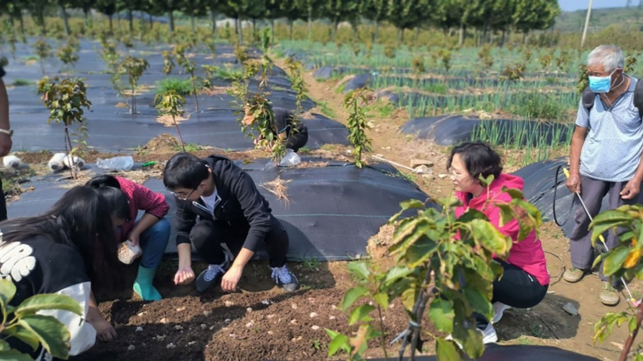 大球盖菇菌丝抗逆性强,对原料要求不严格,栽培管理粗放,可进行林下栽培。于是团队创新性的提出了在果园闲置期,利用果木屑和枝条作为原料,开展果园林下栽培大球盖菇模式。建立了“果菇结合”、“以菌助农”的新产业模式,并积极探索推广,鲁东大学食用菌系的教师开始带领研究生们为助力乡村产业振兴开展一系列志愿服务活动。