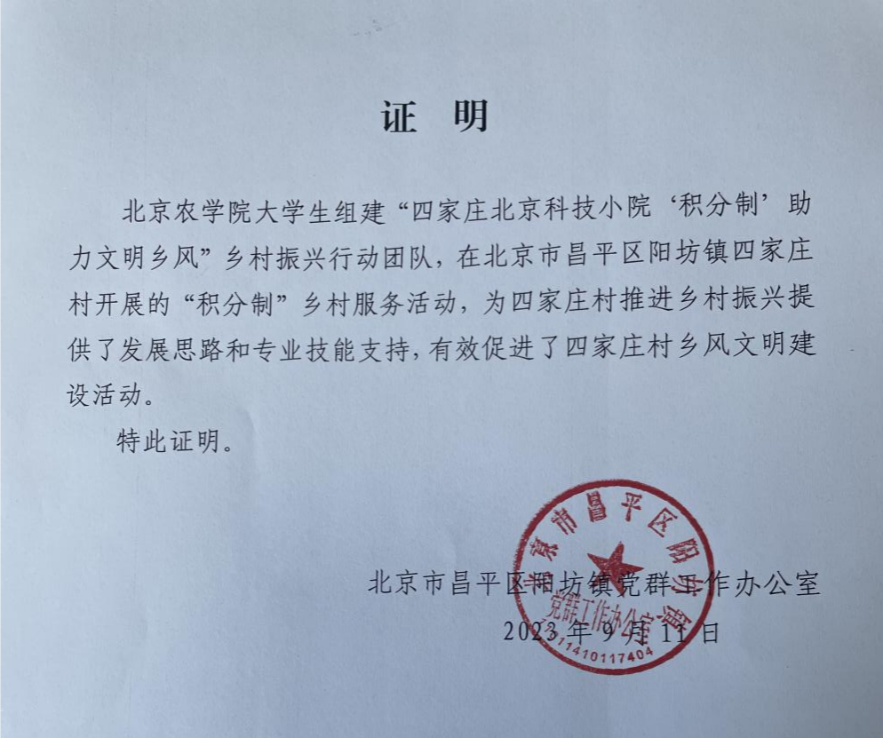 2023年,北京农学院社会实践团队到昌平区阳坊镇人民政府组织部门、宣传部门和农村工作部门进行顶岗服务,并以四家庄村“北京科技小院”为载体,开展乡村振兴行动的实践与服务活动。