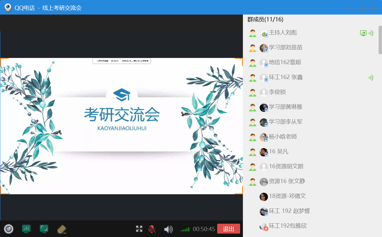 为进一步加强学院同学对研究生入学考试的认识,浓厚学习氛围,4月22日下午,资源与环境学院举办了线上考研交流会,团委副书记杨小晗出席此次会议,2016级优秀考研学子吴凡、章超、张鑫、李俊锁、张文静、胡文朗应邀担任主讲,2017级考研学生及2018、2019级部分学生参加本次交流会。
