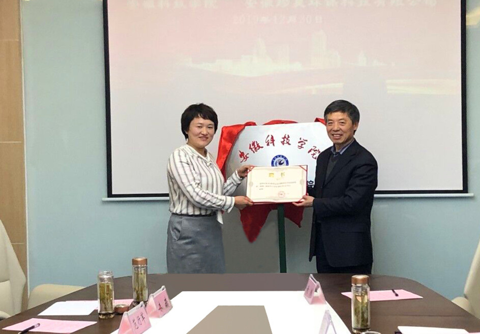 签约仪式上,蒋德勤和高峰共同为“珍昊环保学院”和“安徽科技学院产学研合作基地”、“安徽科技学院校外教学实践基地”揭牌;蒋德勤为高峰、陈成侠颁发了安徽科技学院特聘教授证书。