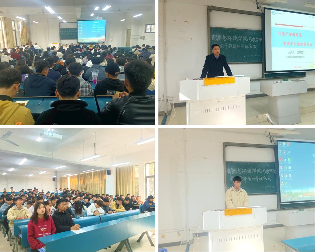 为强化学生干部责任意识、指导学生干部学习工作、加强学生干部班级管理。11月24日中午,资源与环境学院与农学院在新知楼B103教室联合举办了学生干部培训开班仪式,资源与环境学院党委副书记沈树周、党政办主任吴国良、团委副书记杨小晗、学生会指导老师王丽萍、农学院党委副书记张轶辉,团委书记郑玉莲,专职辅导员汪道兵,新生辅导员杨孝延受邀出席此次会议。资源与环境学院与农学院学生会全体成员和21级班级班长,团支书及学委参加本次会议,本次会议由杨孝延主持。