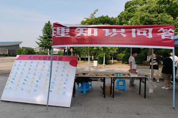 为全面提升学院心理育人工作质量,着力培育学生自尊自信、理性平和、积极向上的健康心态,5月25日,资源与环境学院与生命与健康科学学院,人文学院,以及外国语学院在西区小广场联合举办了5·25心理知识问答活动。