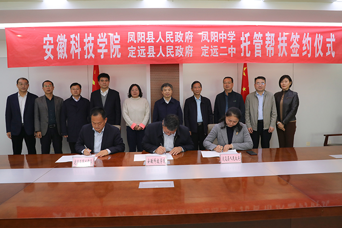 10月28日上午,安徽科技学院与凤阳县人民政府、定远县人民政府、凤阳中学、定远县第二中学托管帮扶签约仪式在凤阳校区图书馆十楼会议室举行。校党委书记蒋德勤,党委副书记、院长李震,党委委员、纪委书记、监察专员王强,党委委员、副院长李升和,凤阳县人民政府副县长张艳,定远县人民政府副县长许倩,滁州市、凤阳县、定远县教育体育局、凤阳中学、定远二中相关领导同志参加仪式。