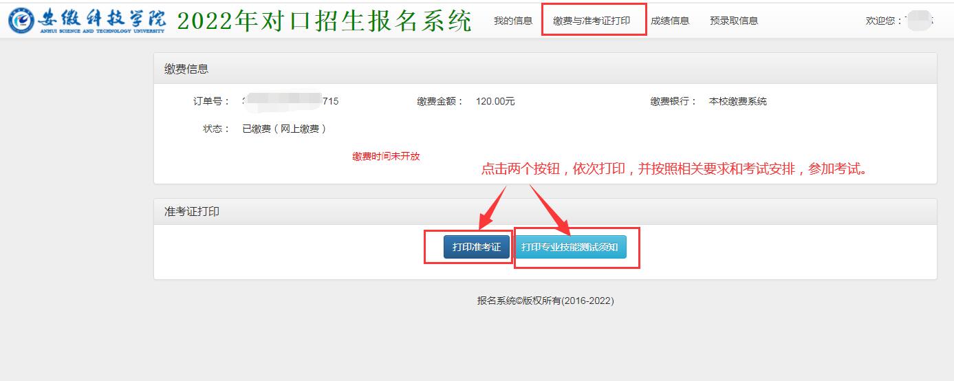 根据学校2022年对口招生职业技能考试安排,请按照以下操作流程打印考生准考证和专业技能测试须知,并按照相关要求,参加考试。如有疑问,可咨询安徽科技学院招生办公室0550-6732041,0552-3197041。