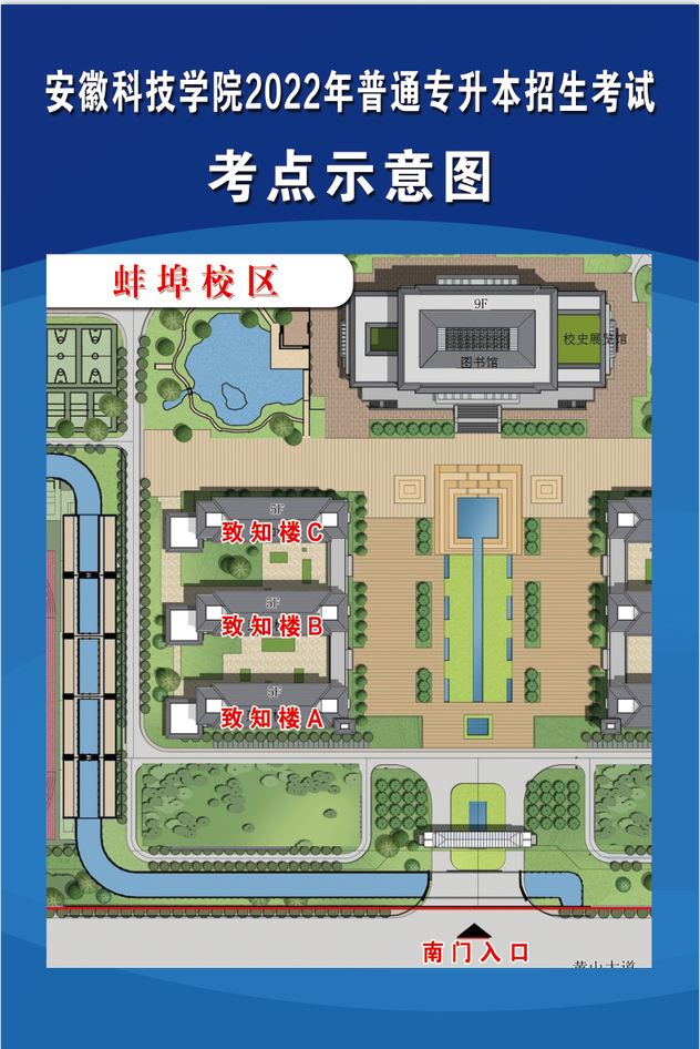 安徽科技学院2022年普通专升本招生专业课考试将于7月3日在学校蚌埠龙湖校区举行,考生可于上午7:50从学校南门进入校区。根据疫情防控要求,请考生做好个人防护,带好口罩,与他人保持合理间距,减少近距离接触和交流。入校时请配合工作人员核验安康码、行程码、核酸检测阴性报告,体温测量、身份核验,提交《安徽科技学院2022年普通高校专升本招生专业课考试考生健康承诺书》。入校后到指定考场等候考试开始(考点示意图如下),考生如出现安康码异常等情况,请提前和我校招生办公室联系0550-6732178,6733934。请考生认真阅读准考证考生守则,遵守考场纪律。