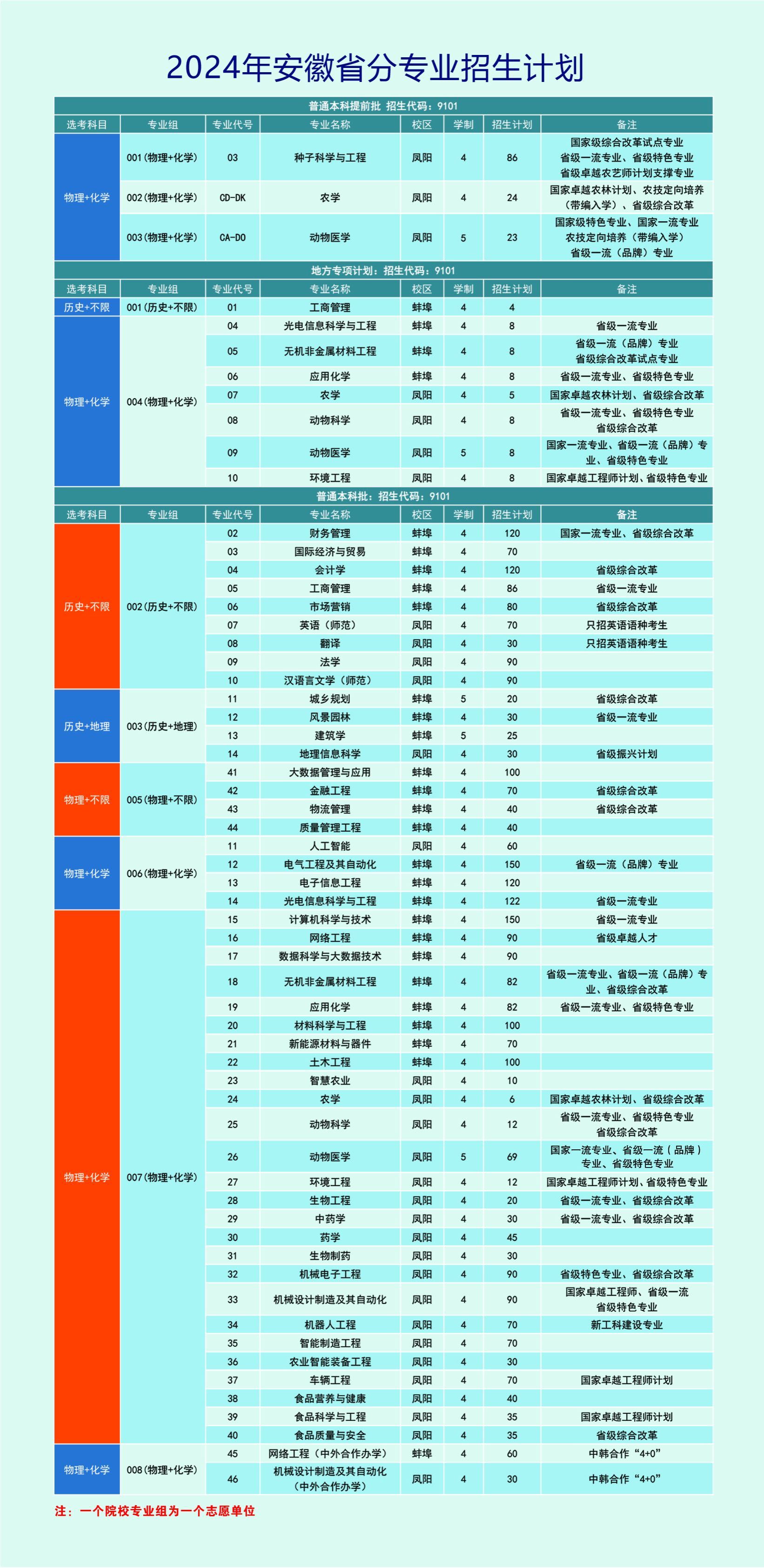 安徽科技学院2024年普通高考招生计划